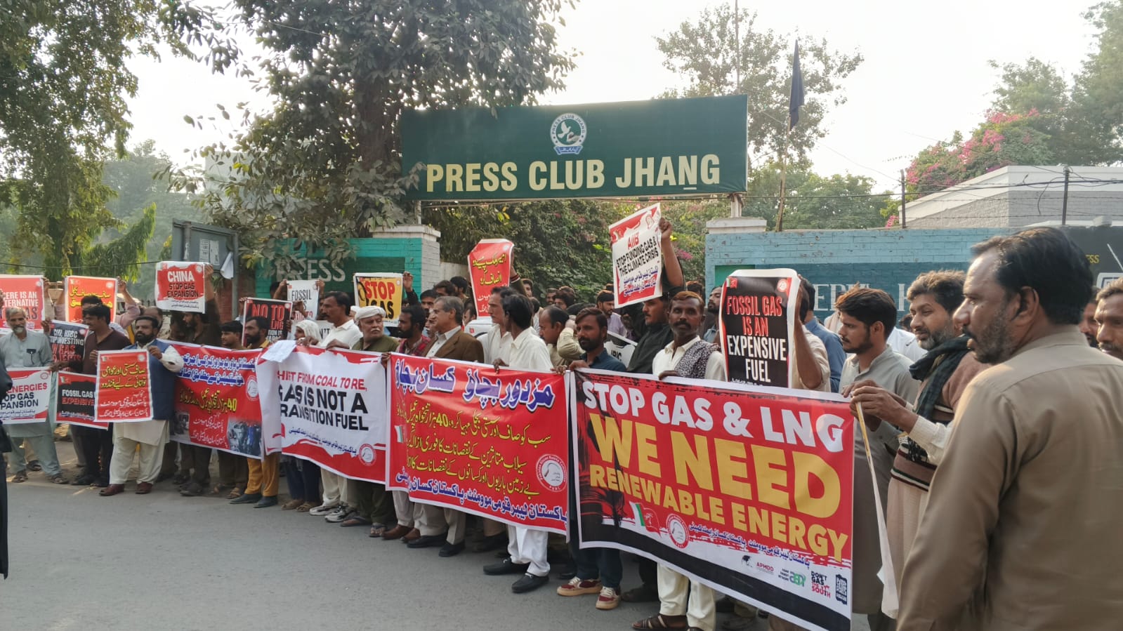Jhang: As part of the Don’t Gas the South campaign’s Global Day of Action Against Gas Expansion, workers, farmers, trade unionists and community leaders gathered outside the Jhang Press Club on Wednesday to denounce the expansion of fossil gas infrastructure in Pakistan and across the Global South. The demonstration was organised by Pakistan Kissan Rabita Committee (PKRC) and Labour Qaumi Movement (LQM).