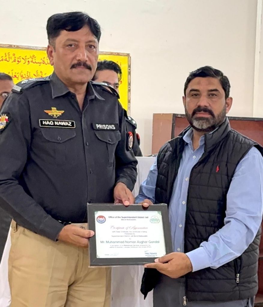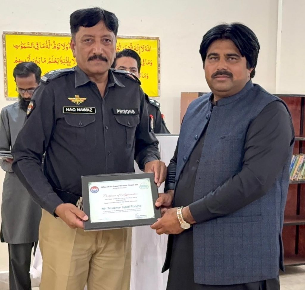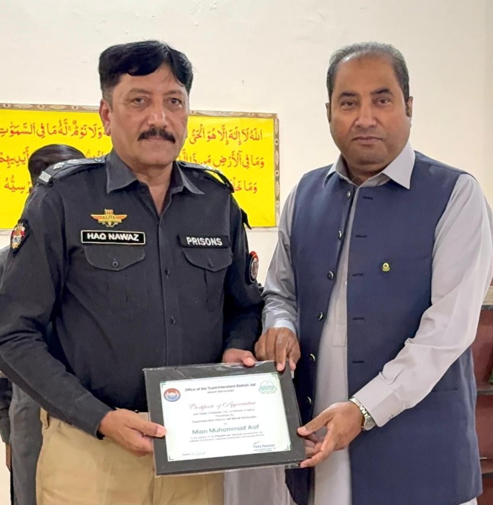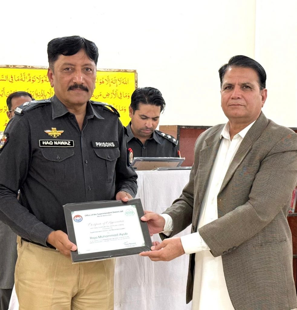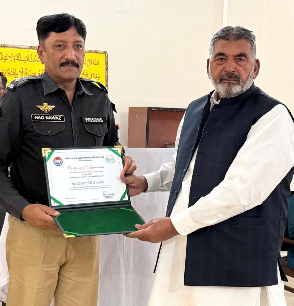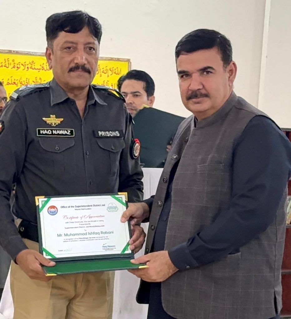 Special Instructions of Inspector General of Prisons Punjab Mian Farooq Nazir, a special ceremony was organized at District Jail Mandi Bahauddin by Senior Superintendent District Jail Mandi Bahauddin to distribute honorary certificates among the philanthropists who have rendered outstanding social services. Senior Superintendent Jail Haq Nawaz distributed honorary certificates among 25 philanthropists. Ehsanullah Sahi, Mian Asif Shabbir, Raja Muhammad Ayub and other participants thanked the Superintendent Jail for this encouragement and said that this recognition has not only increased our confidence but also awakened the spirit of performing better in the future. The ceremony paid tribute to discipline, reform measures and the professional efforts of the jail officers. On this occasion, Superintendent Jail Haq Nawaz said in his address that encouraging those who perform best is the top priority of the institution. We pay our heartfelt tributes to you in recognition of your social services. You are the ones who have dedicated not only their resources but also their attention, love and sense of responsibility to the reform and welfare of our imprisoned brothers. Your cooperation has strengthened the reform system here and created a belief in the hearts of the prisoners that society does not close its doors to them but rather extends its hand to improve them. The role you have played in improving this institution through donations, active cooperation and practical steps is commendable.