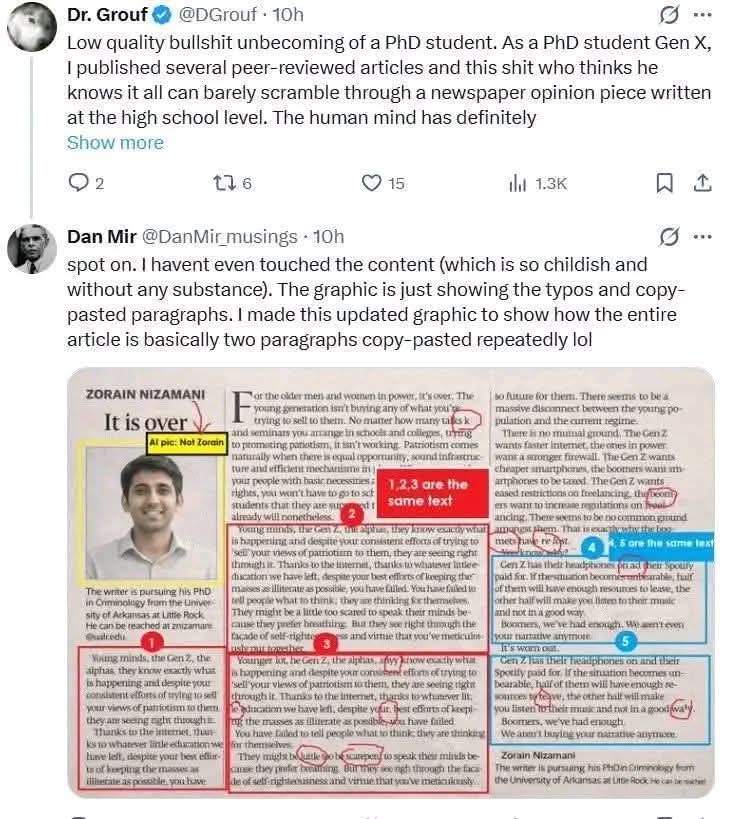 What makes the editorial decision more comprehensible is the article itself. A careful reading of the published version, screenshots of which continue to circulate, reveals a troubling lack of editorial polish. Entire sentences and paragraphs are repeated almost verbatim, arguments circle back on themselves without development, and basic proofreading errors remain unaddressed. Such lapses are not matters of ideological disagreement; they are issues of journalistic competence. For an opinion piece presented as a generational diagnosis and authored by an academic affiliated with a foreign university, these flaws are particularly glaring.