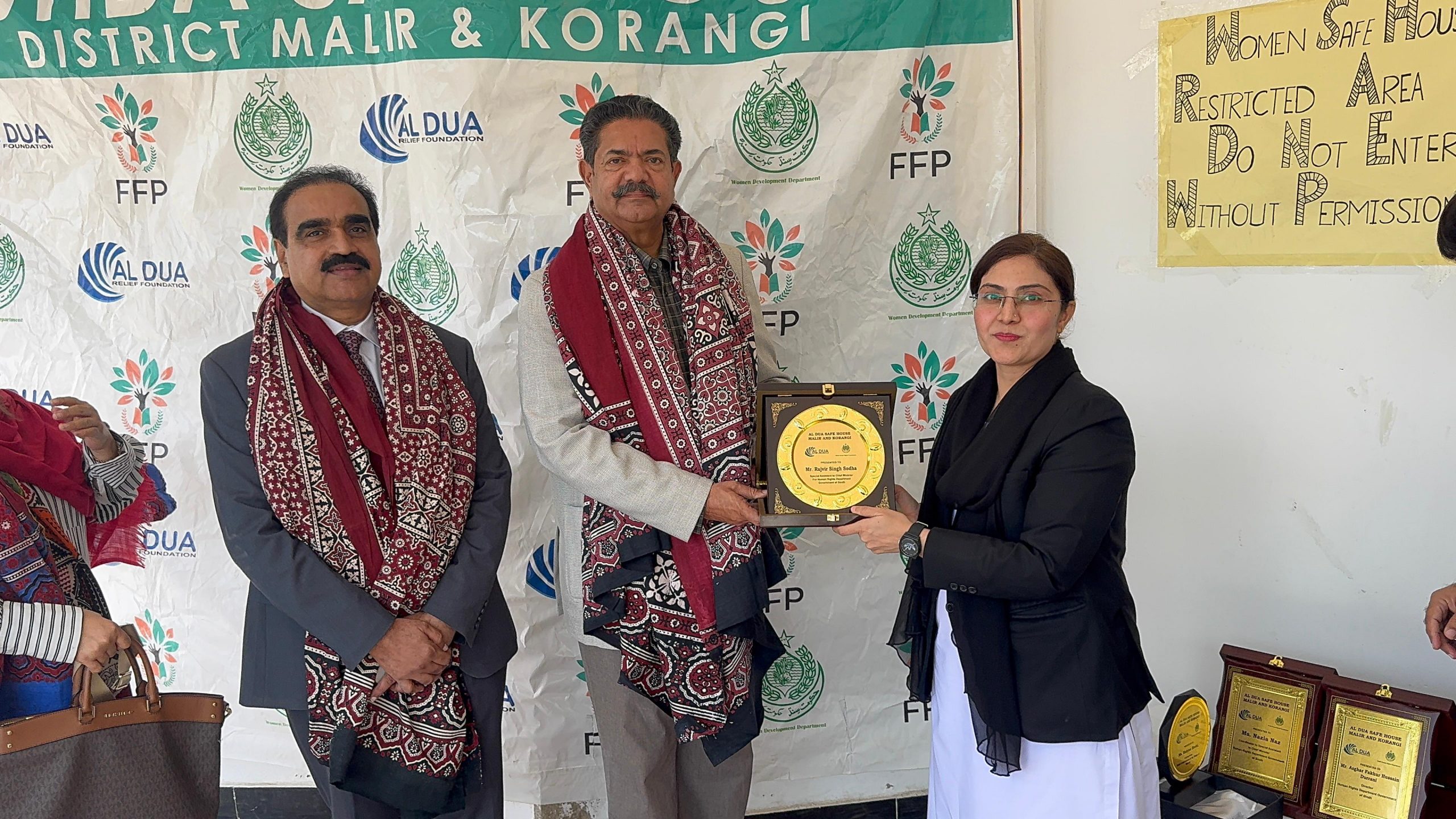 Mr. Sodha was warmly received by Assistant Director WDD, Mr. Imran Shaikh, along with Ms. Humaira, Chairperson of Al Dua Relief Foundation. On behalf of the management, a commemorative shield was presented to the SACM as a gesture of appreciation. During the visit, detailed briefings were provided regarding the services offered to survivors of violence, including shelter, legal aid, psychosocial support, and rehabilitation assistance.