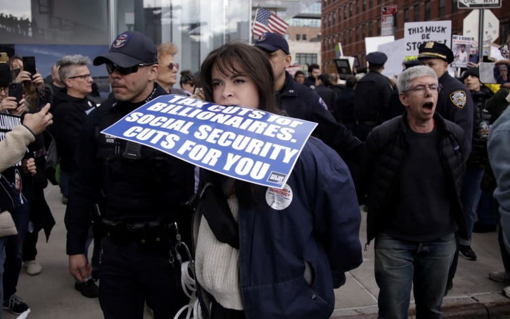At least nine people were arrested outside a New York City Tesla dealership as demonstrators protested what they described as