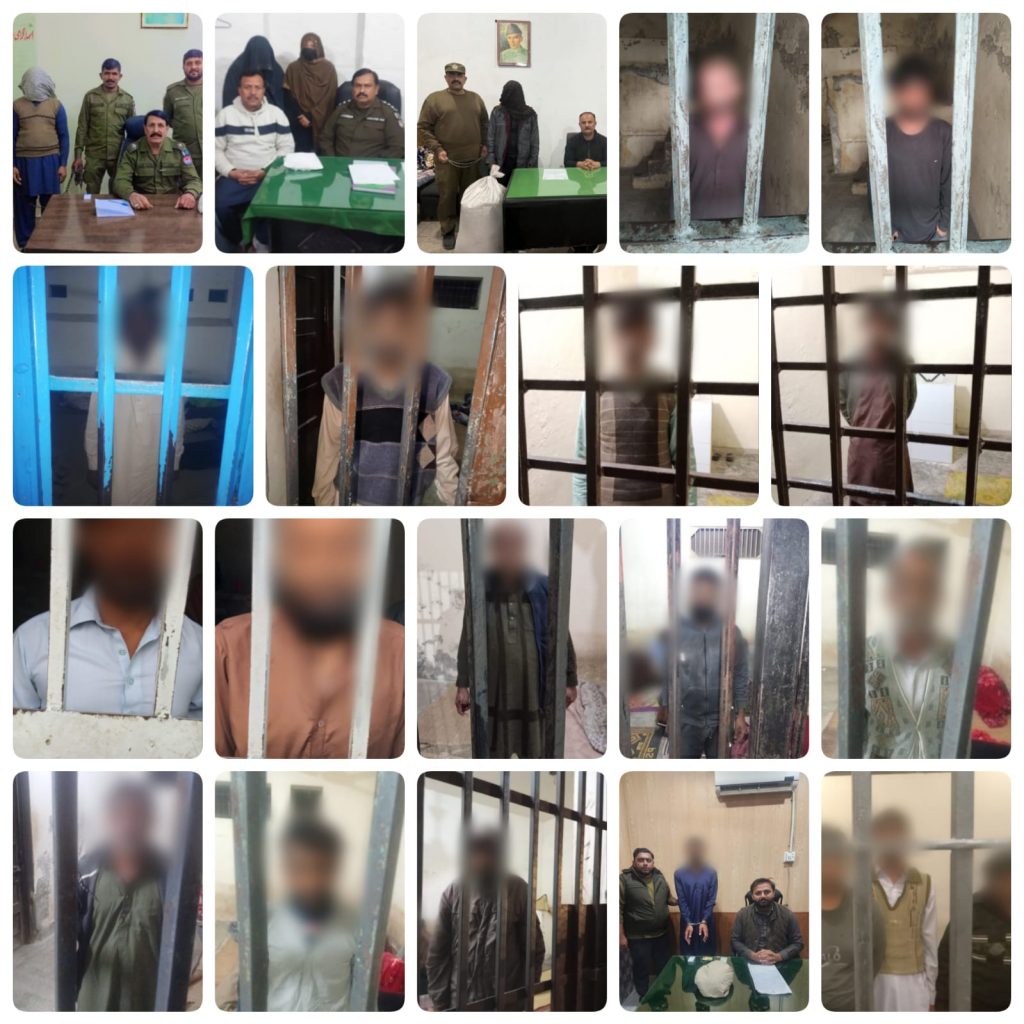 According to police officials, the arrested suspects have been identified as Asghar, Waseem, Shoaib, Farooq, Sarfraz, Azam, Sajida Parveen, and others. From their possession, the police seized 15 kg 720 g of charas, 9 kg 540 g of heroin, 1 kg 20 g of ice, 10 kg 60 g of bhuki, and 278 liters of liquor.