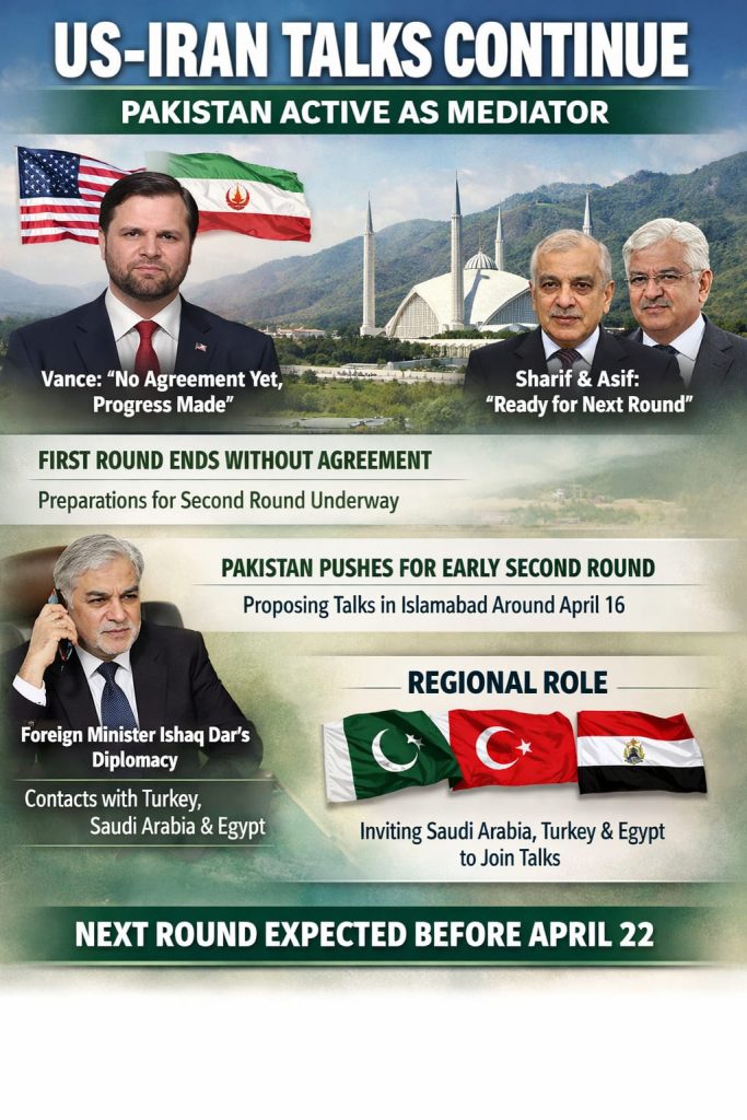 Pakistan has proposed starting the second round of US-Iran talks before April 22 and has offered to host it again. Prime Minister Shehbaz Sharif and Defence Minister Khawaja Asif have indicated positive progress. The second round could potentially take place around April 16, with Pakistan playing an active role in the arrangements.